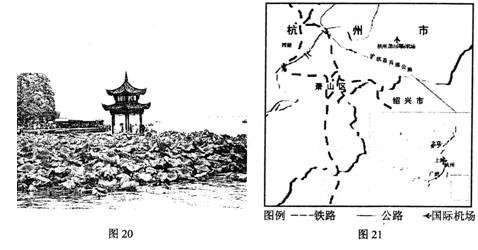 2011年6月24日在巴黎举行的世界遗产委员会第35次大会上,中国杭州西湖文化景观被列入新的世界遗产名录。图20为杭州西湖景观图,图21为杭州地图。