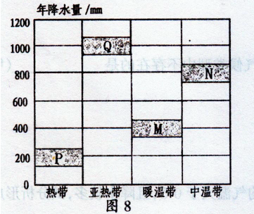 5、单选题 图中,P、Q、M、N为四个不同的区域,读图回答以下各题。1.图8中,与云贵高原气候特征相符合的区域是2.立足于农业可持续发展,最适合农牧业结合发展的地区是3.N地区的自然带名称最有可能是4.下列描述符合P、Q、M、N四地实际情况的是