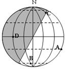 4、综合题 读某一时刻的地球光照图,阴影部分表示夜半球,回答下列问题。(每空1分,共10分)