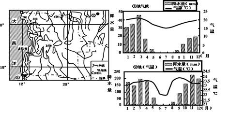 (2)由图可以看出:①地降水量最多月小于50mm,降水量小于②地;①地终年少雨,②地降水冬多夏少,有明显的季节变化。① 地受从陆地吹向海洋的东南信风和副热带高压交替控制,且沿岸有本格拉寒流经过,降温减湿。故终年少雨;②地纬度低,是热带草原气候,冬半年受东南信风控制,降水较少,夏半年受赤道低压控制,降水多。