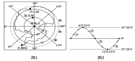 3、单选题 下图为“我国南极科学考察站分布示意图”。其中昆仑站于2009年1月27日建成,这是我国在南极内陆建立的第一个科学考察站。图2为“太阳直射点回归运动示意图”。读图完成以下问题。