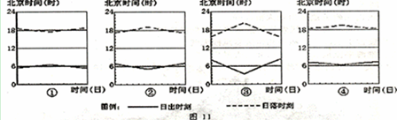 小题2:图11是依图10时间序列绘制成的日出、日落时刻的变化示意图,能够反映该观测地点昼夜长短变化特点的是