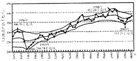 3、单选题 下图表示我国人均粮食产量变化情况。图中人均粮食产量围绕着趋势线在一定范围内波动,从中间的趋势线到边沿的宽度,即为平均的波幅,平均波幅与趋势线之比,表示粮食产量的稳定性高低。波幅越大,粮食产量越不稳定。阅读图文资料,完成1~2题。