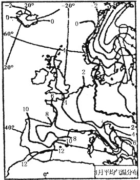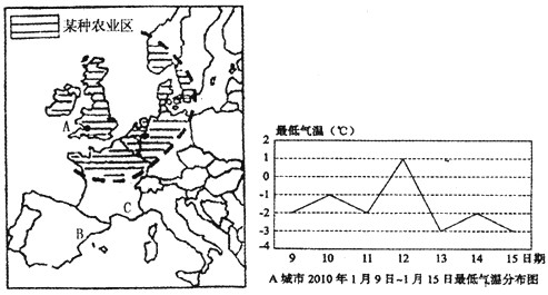 1、综合题 读欧洲西部区域图、某种农业区图,结合A城市最低气温资料回答下列问题。(1)概括图中农业区区域内(阴影部分)1月气温分布规律并分析其形成原因。