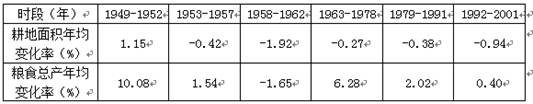 4、单选题   读“长江三角洲不同时段耕地面积与粮食总产年均变化率表”,据表可知