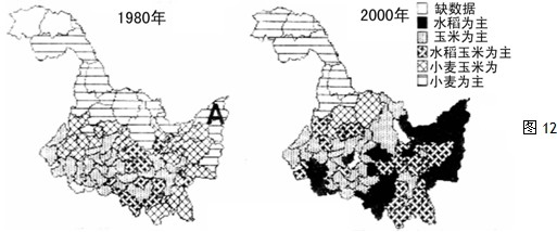材料一:图12是1980年和2000年黑龙江省三大粮食作物分布示意图。
