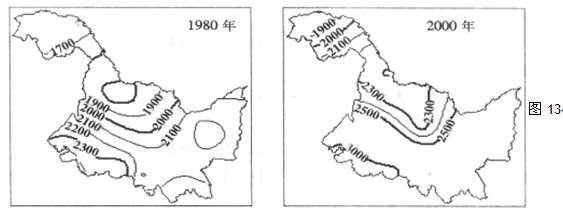 材料二:图13是1980年和2000年黑龙江省积温(℃)等值线分布示意图。