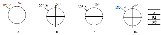 1、单选题 下列四幅图中,表示北京时间8时整的是(提示:太阳都从一个方向直射;N表示北极)