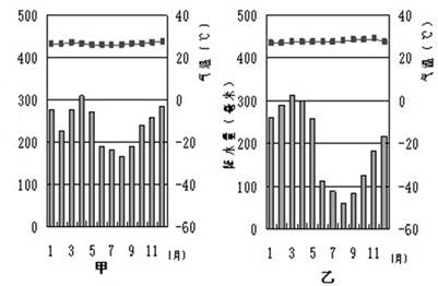 (1)主要从相同点和不同点两个方面来回答,气候特征包括气温和降水两个要素,还有水热搭配类型;分析原因,要从什么地点什么时间发生了什么地理时间角度来看,A地每年7-9月份降水量明显大于B地,形成原因是地形不同形成,A地附近有山脉,形成地形雨。