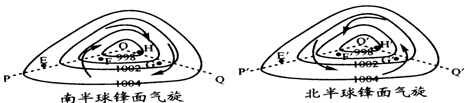 2、填空题 读图 “南北半球锋面气旋理想模式图”,完成问题。
