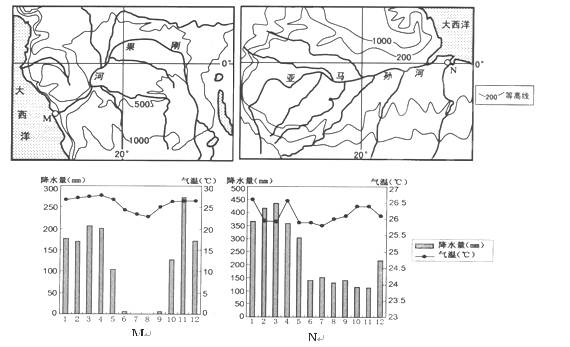 3、综合题 (20分)下图为世界两大主要的雨林分布地区略图,图M、图N分别为上图中M、N地的气温曲线一降水柱状图,读图回答下列问题。