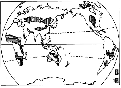 小题2:温带草原分布最广的亚欧大陆;我国内蒙古地区的植被类型属于温带草原;温带草原主要分布在中纬度地区的大陆中部,属于从沿海向内陆的地域分异规律;热带草原主要分布在南北纬10°到南北回归线之间,属于从赤道向两极的地域分异规律。