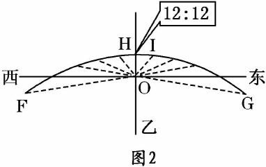 图1为青云花园小区分布平面图,图2为该小区学校研究性学习小组绘制的某一日内旗杆杆影轨迹示意图(O为立杆处,虚线为杆影,曲线为杆影端点轨迹,12:12时问为北京时间)。