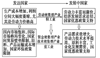 (1)从产业转移的规律分析,发达国家向发展中国家进行产业转移主要是因为本国发展制约性增强,发展中国家资源优势明显,地价便宜,劳动力廉价,市场广阔。具体原因分析如下: