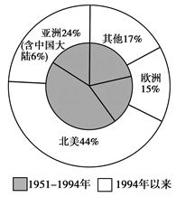 2、单选题 近年来中国成为吸收日本对外直接投资增长最快的地区之一。读“日本产业外移地区投资比率图”,回答题。