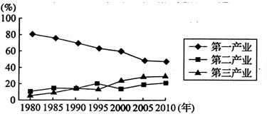 2、单选题 下图是我国中部某省三大产业就业比重变化图。据此完成下列各题。