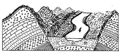 下降岩块(地堑)成谷地或低地(渭河平原、汾河谷地)。图示河谷处的地质构造为断裂下沉而形成的地堑,河谷沉积物的形成反映流水沉积作用。所以本题选择C选项。