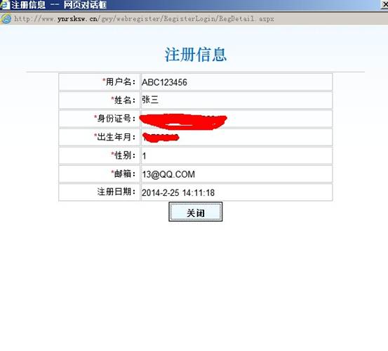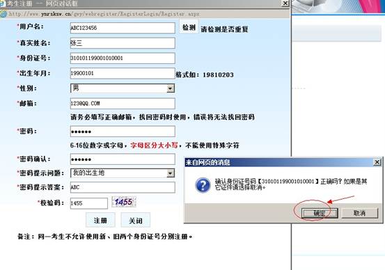 第五步:填写注册信息(以下为示例),检验身份证号是否正确,如不正解点击“取消”重新修改,确认正确后点击“确定”。建议:不止校对身份证号,请校对所有填写信息是否正确,如不正确,请点击“取消”进行修改,信息一旦保存便不能再修改。