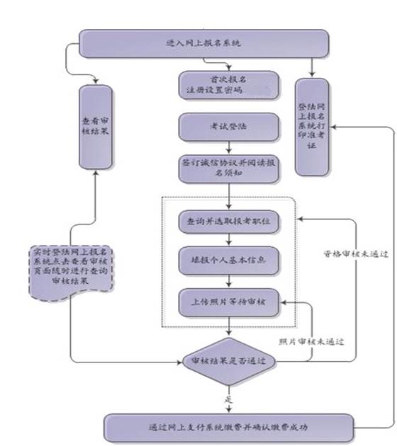 基本流程为:登录报名网站—>阅读并同意考生诚信承诺—>进入报名界面按报名系统提示填写报名信息—>上传近期清晰免冠电子照片—>等待报名资格审核—>审核通过后网上缴费。