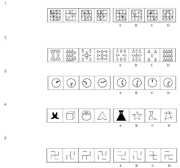 1.【答案】C。解析:第二、三、四个图形中的斜线都可以在第一个图形中找到。选项中只有C项满足这一规律。