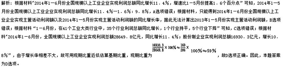 C: 2014年1—6月份,41个工业大类行业的利润总额不是同比增长,就是同比下降