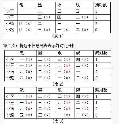 5、单选题 张老师将文房四宝装在一个有四层抽屉的柜子里,让学生猜笔、墨、纸、砚分别在哪一层。按照笔、墨、纸、砚的顺序,小李猜测四宝依次装在第一、二、三、四层,小王猜测四宝依次装在第一、第三、第四和第二层,小赵猜测四宝依次装在第四、第三、第一和第二层,而小杨猜测四宝依次装在第四、第二、第三和第一层。张老师说,小赵一个都没有猜对,小李和小王各猜对了一个,而小杨猜对了两个。>由此可以推测_____。