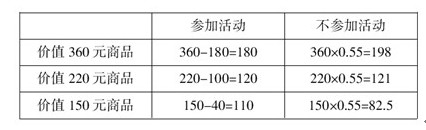 2、单选题  某商场举行周年让利活动,单件商品满300减180元,满200减100元,满100减40元;若不参加活动则打5.5折。小王买了价值360元,220元,150元的商品各一件,最少需要多少元钱?_____