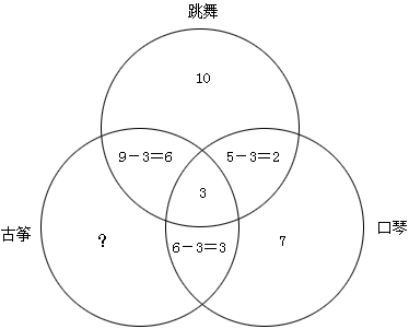2、单选题 某大学的文艺社团中,会跳舞的、会吹口琴的会弹古筝的共有38人,其中只会跳舞的有10人,只会吹口琴的有7人,既能弹古筝又会吹口琴的有6人,既会跳舞又会吹口琴的有5人,既会跳舞又会弹古筝的有9人,三种都会的有3人,则只会弹古筝的有多少人?_____