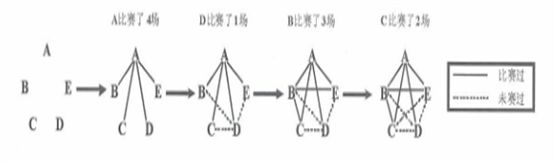 题目详解:如图所示:比赛过的两支球队间用实线连接;未赛过的两支球队用虚线连接;