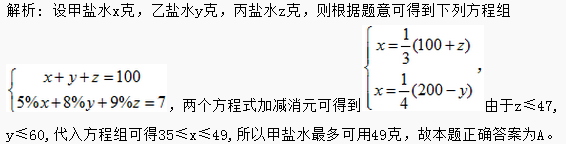 2、单选题 有甲乙丙三种盐水,浓度分别为5%、8%、9%,质量分别为60克、60克、47克,若用这三种盐水配置浓度为7%的盐水100克,则甲种盐水最多可用_____