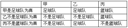 5、单选题 甲、乙、丙三人来自学校足球队、乒乓球队、篮球队。下列说法只有一种对的: (1)甲是足球队的;(2)乙不是足球队的;(3)丙不是篮球队的。甲、乙、丙三人分别是哪一个队的?_____