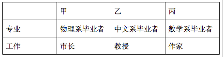 5、单选题 高中同学聚会,甲、乙、丙在各自的工作岗位上都做出了一定的成绩,成为了教授、作家和市长。另外, (1)他们分别毕业于数学系、物理系和中文系 (2)作家称赞中文系毕业者身体健康 (3)物理系毕业者请教授写了一个条幅 (4)作家和物理系毕业者在一个市内工作 (5)乙向数学系毕业者请教过统计问题 (6)毕业后,物理系毕业者、乙都没再和丙联系过则可知_____。