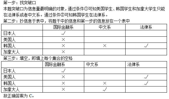 4、单选题 某宿舍住着四个留学生,分别来自美国、加拿大、韩国和日本。他们分别在中文、国际金融和法律三个系就学,其中: (1)日本留学生单独在国际金融系; (2)韩国留学生不在中文系; (3)美国留学生和另外某个留学生同在某个系; (4)加拿大学生不和美国学生同在一个系。以上条件可以推出美国留学生所在的系为_____。
