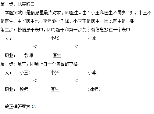 2、单选题 关于小王、小李和小张,我们知道他们三人中一位是律师,一位是医生,一位是教师,并且我们还知道:小张比教师的年龄大;小王和医生不同岁;医生比小李年龄小。由此可知_____。
