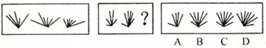 单选题 _____A: AB: BC: CD: D 参考答案: C 本题解释:正确答案是C考点平面-数数解析观察发现,第一组图形中短线条分别有1、3、4条,前两个图形短线条之和为第三个图形短线条。依此规律,第二组长线条已有2、4,那么未知图形中应该有(2+4)6条长线条。故正确答案为C。