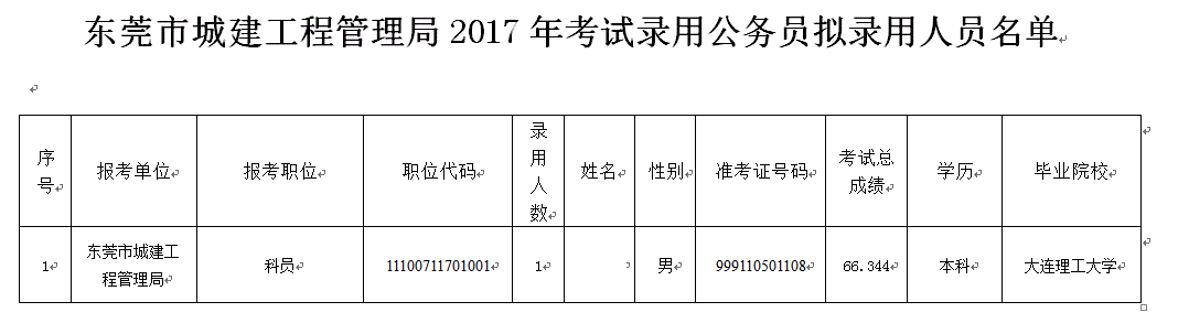 原标题:东莞市城建工程管理局2017年考试录用公务员拟录用人员公示
