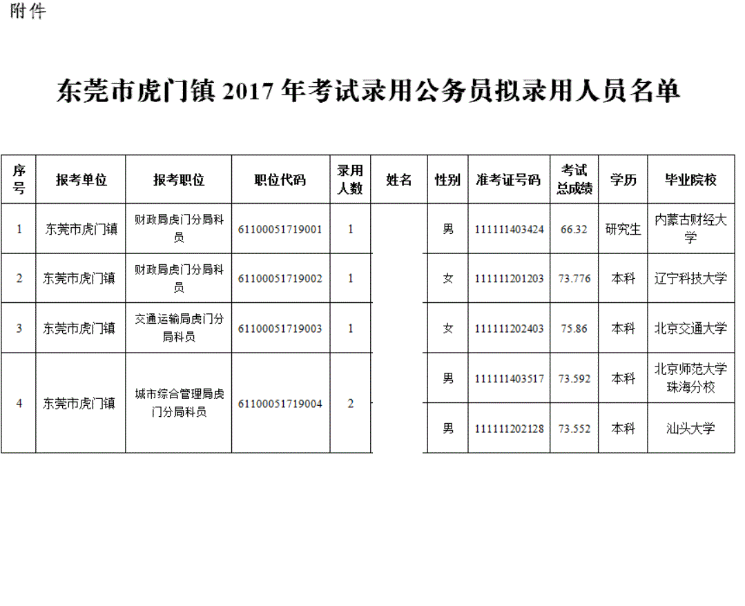 原标题:东莞市虎门镇2017年考试录用公务员拟录用人员公示