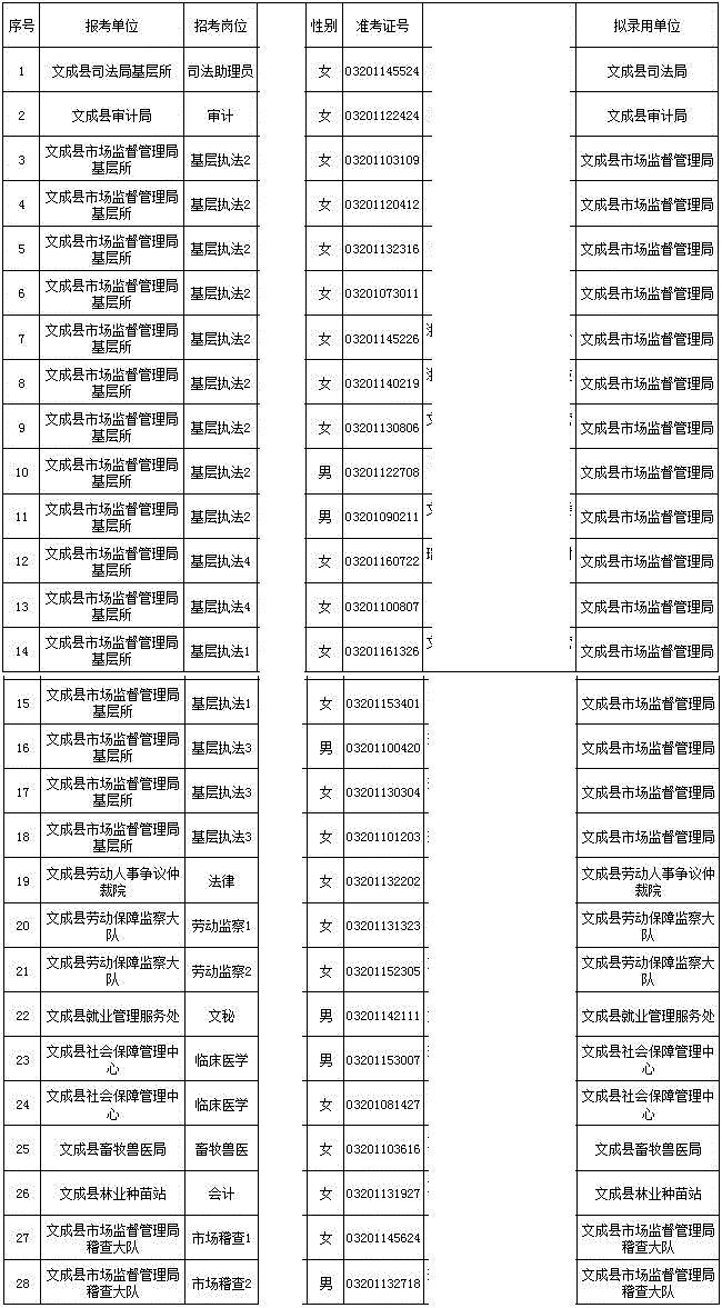 2016年文成县各级机关考试录用公务员拟录用人员名单