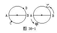 【例6】如图38-1,A、B是圆的一条直径的两端,小张在A点,小王在B点,同时出发逆时针而行,第一周内,他们在C点第一次相遇,在D点第二次相遇。已知C点离A点