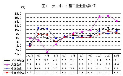 2012某省规模以上工业增加值10875亿元,比上年增长7.1%,年度增速从1-2月的2.9%日升到10-12月的10%以上。大型、中型和小微型企业增加值分别为3074.3217和4584亿元,比上年分别增长8.2%、6.8%和6.7%。