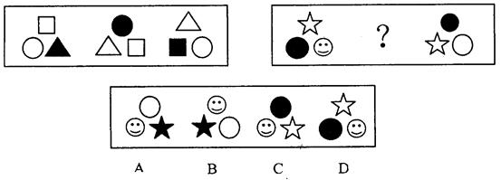 81. 【解析】在第一套图中,图形顺时针旋转,而黑色图形出现在不同的部位,第二套图同样遵循这一规律,所以选A。