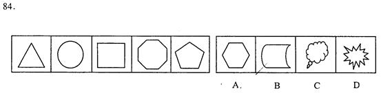 84.【解析】左边五个图形都是规则图形,即正三角形、圆、正四边形、正八边形、正五边形,所以最后一项也应为规则图形,选A。