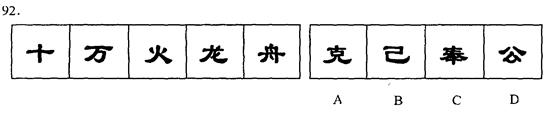 92.【解析】左边五个字的笔划数分别为2、3、4、5、6,所以第六个字的笔划数应为7,选A。
