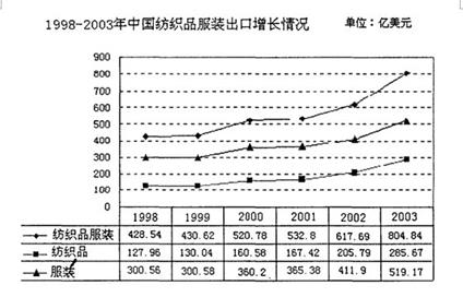 151.【解析】解本题时的纺织品服装指的是图中表格的纺织品服装。由统计图纺织品服装曲线的趋势很容易看出2003年中国纺织品服装出口的年增长率比1999年大得多,所以选C。