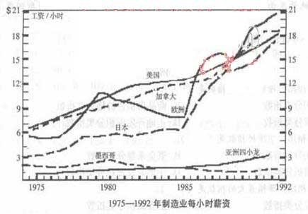 A.亚洲四小龙每小时工人的工资一直是最低的