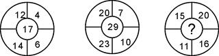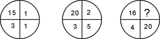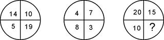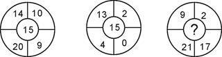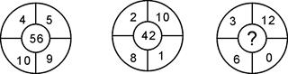 (二)每题图形中的数字都包含一定的规律,请你总结前两个图形中数字的规律,从四个选项中选出你认为问号应该代表的数字。