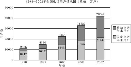 98. D[解析] 根据96题知2002年相对2001年的增速为42.3%,如果保持这一速度,那么2003年的移动电话用户应为:20662×(1+42.3%)≈29402(万户),D项最接近,故答案为D。