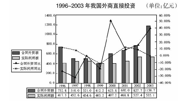 D、1996年至2003年,我国外商直接投资的合同资额呈连续递增态势。