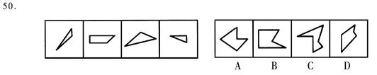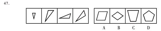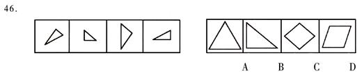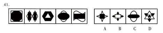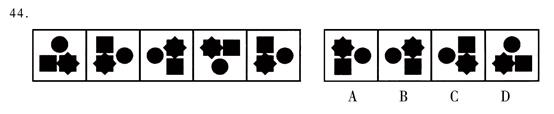 44.B【解析】此题的解题点是图形的位置。前五个图都是由圆形、方形、多边形这三个图形经过旋转后得到下一个图形,并且这三个图形的相对位置保持不变。只有B选项图形的相对位置与前面的图形一致。