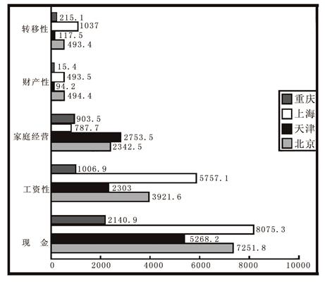 (3)转移性收入中,上海最多,天津最少,两者相差最多。